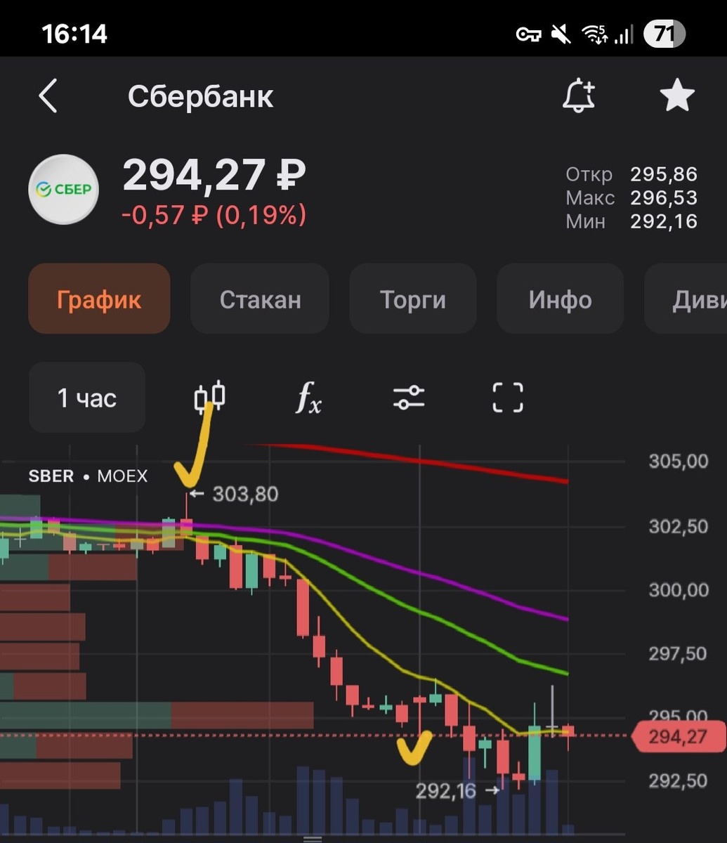 В ответ на пост 📉 А еще в пятницу в #SBER Сбер и компания (#LKOH, #SIBN, #NVTK и другие) был так называемый ударный день, когда от рассвета до заката рынок и актив движется в одном направлении практически безоткатно. Это бывает в обе стороны, что на падение, что на рост. И если безоткатный рост - это признак либо дурачины, либо шортокрыла, то безоткатно вниз широким фронтом - это крайне плохой сигнал. В Сбере нормальный диапазон хода за день укладывается в 10-12 рублей, бОльший диапазон - обычно уже только на импульсах, но не на таких безоткатных движениях. В пятницу в Сбере был именно ударный день на снижение с диапазоном хода внутри дня около 10 рублей. Далее логична передышка, следующая остановка по горизонтальным уровням - 275+-2, потом - уже только 220+-5 🐻