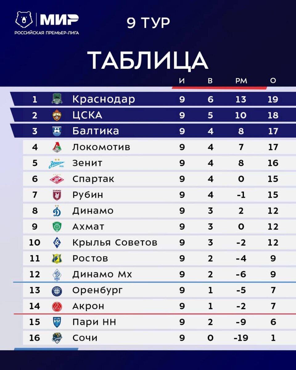 Позиции команд чемпионата после матчей девятого тура РПЛ. На подходе треть сезона!