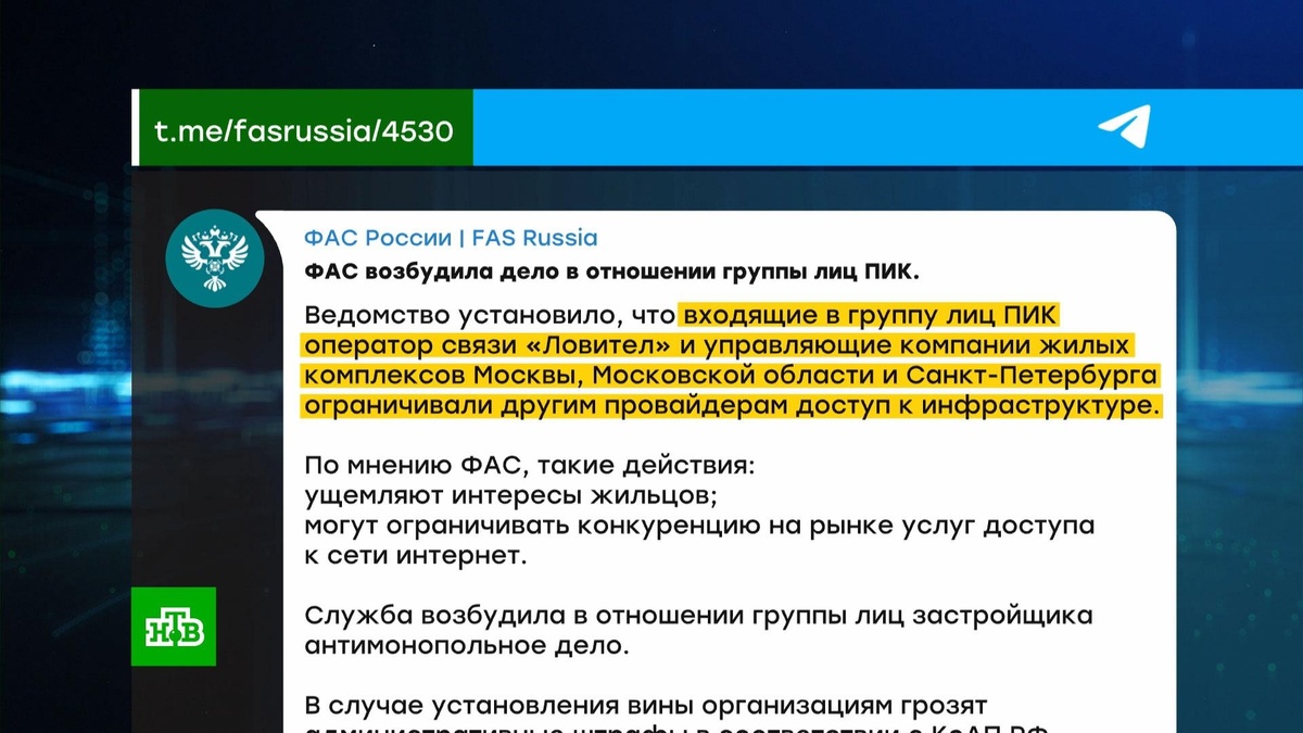 [ Смотреть видео на сайте НТВ ] ФАС считает, что застройщик ограничивал доступ сторонних интернет-провайдеров в свои ЖК. Федеральная антимонопольная служба возбудила дело «в отношении группы лиц» застройщика ПИК. Ведомство пришло к выводу, что входящие в группу лиц ПИК оператор связи «Ловител» и управляющие компании жилых комплексов Москвы, Московской области и Санкт-Петербурга ограничивали другим провайдерам доступ к инфраструктуре. Из-за ситуации с провайдерами в домах ПИК жильцы этих ЖК серьезно пострадали. 21 марта 2025 года «Ловител» оказался целью DDoS-атаки. Как сообщил Роскомнадзор, инфраструктура компании оказалась не готова к такому удару. Из-за этого в домах застройщика не просто пропала связь — отключились домофоны и люди не могли попасть в свои квартиры. После начала DDoS-атаки жители подали жалобу в ФАС. ФАС пришла к выводу, что действия застройщика ущемляют интересы жильцов, а также могут ограничивать конкуренцию на рынке интернет-услуг. Компаниям группы грозят штрафы от