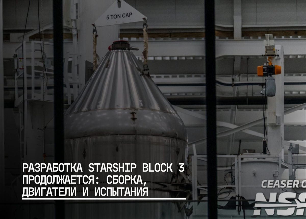 SpaceX активно готовит Starship следующего поколения — Block 3. В Starbase ведется сборка Ship 39, а в McGregor проходят испытания двигателей Raptor. На корабле завершается монтаж системы термозащиты, в то время, как команда работает над прототипом Super Heavy для следующего полёта. Планы запуска Block 3 намечены на 2026 год. Параллельно с этим в McGregor недавно зафиксирован рекордный прожиг Raptor 3 продолжительностью 354 секунды, близкий к максимальному требуемому времени работы в полете. При этом некоторые тесты заканчивались аварийным отключением, что подчеркивает сложность и рискованность разработки.
