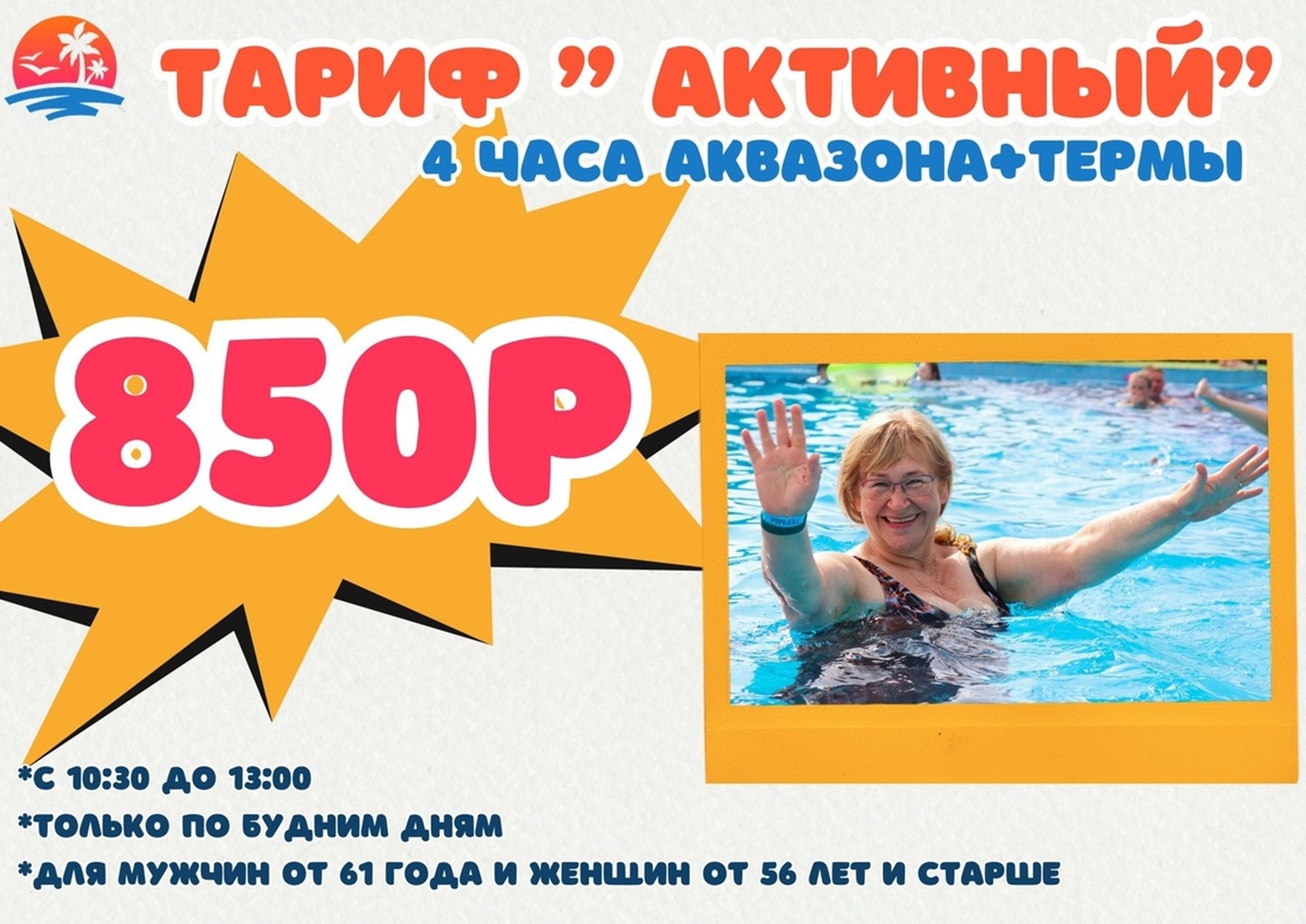 Знакомьтесь с тарифом «Активный» — нашим специальным предложением для тех, кто молод душой, но мудр возрастом! Это не просто скидка, а настоящий пропуск в мир релакса и хорошего настроения. Забудьте о серости за окном и городской суете. Всего за 850 рублей (вместо 1600!) вы получаете: Целебные термы и спа-зона. Подарите своему телу расслабление в целебной воде, снимите напряжение и зарядитесь энергией.