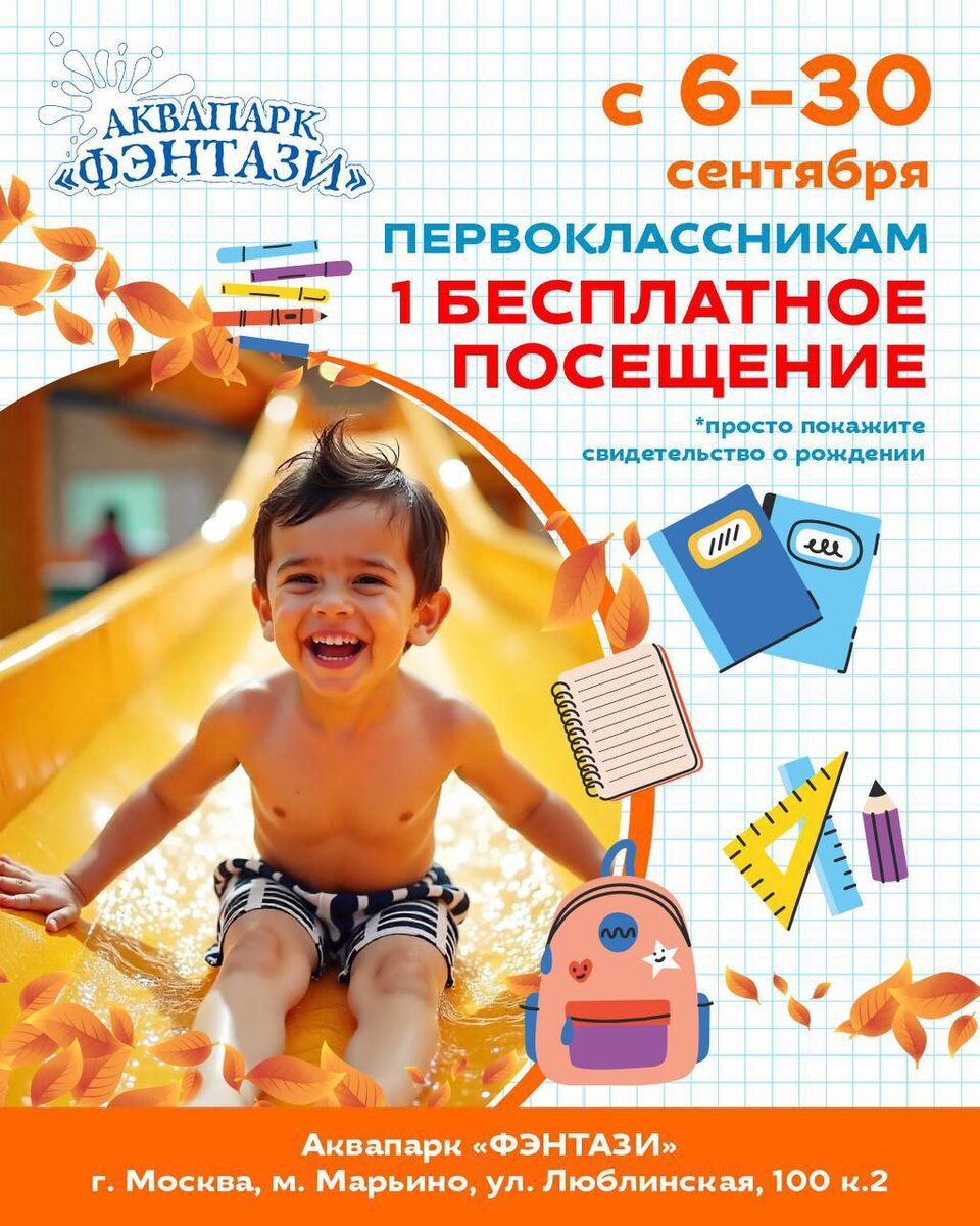 🆓Первоклассникам бесплатно одно посещение аквапарка «Фэнтази»@aquafentazi в сентябре Наш отзыв о посещении аквапарка Фэнтази ЗДЕСЬ 🏅Наградите вашего первоклашку активными и счастливыми семейными выходными в аквапарке «Фэнтази»! ❗️С 6 по 30 сентября 1 посещение аквапарка в любой день по тарифам «Весь день», «3 часа» или «5 часов» для первоклассников будет БЕСПЛАТНЫМ*! Как стать участником Акции? •Посетите аквапарк «Фэнтази» с 6 по 30 сентября включительно • Предъявите ОРИГИНАЛ свидетельства о рождении ребенка на кассе (год рождения должен быть 2017-2019) *Акция не суммируется с другим специальными предложениями аквапарка «Фэнтази» Подробнее ЗДЕСЬ @Together_with_kids Пост носит информационный характер