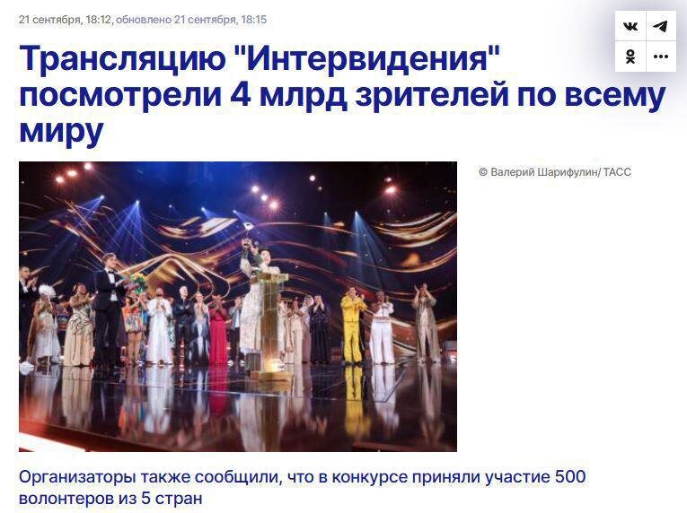 Вы тут недавно жаловались на один мой заголовок. Так вот, не я один 😀 ТАСС тихонько поменяли формулировку про «Интервидение»: сначала было «трансляцию посмотрели 4 млрд человек», а потом стало «трансляция была доступна 4 млрд зрителей». Одно маленькое, вроде бы незначительное изменение в заголовке - но нюанс, согласитесь, есть 😉 Если без иронии, кто-то смотрел? Было интересно?