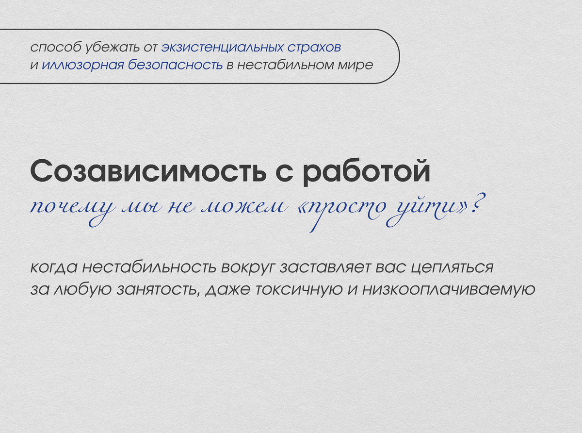 Терпите токсичного начальника, переработки и низкую зарплату, оправдывая это «стабильностью»? Это не преданность делу — это рабочая созависимость. Разбираемся, почему нестабильность вокруг заставляет нас держаться за любую работу, даже разрушающую, и как разорвать этот порочный круг. Это нелогично! Причина — не в деньгах. Наш мозг в условиях хаоса ищет хоть какую-то опору. Токсичная работа становится такой ложной опорой. Вот что происходит в психике: Проверьте себя: 1. Мысль об уходе вызывает панику, даже если работа вас истощает. 2. Вы постоянно оправдываете плохие условия: «Зато стабильно», «Сейчас все так работают». 3. Личность растворилась в должности: вне работы вам сложно ответить на вопрос «Кто я?». Бросать все сразу не нужно. Начните с малого, чтобы восстановить контроль. 1. Разделите страх и реальность