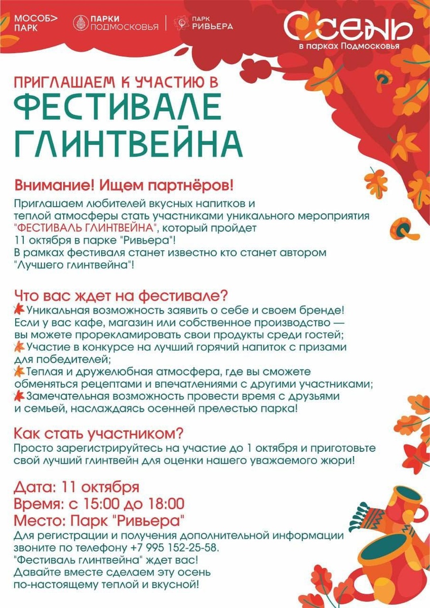 Осень с глинтвейном! 11 октября можайцев угостят ароматным напитком на Фестивале глинтвейна в парке «Ривьера» К участию приглашаются те, кто знает оригинальные рецепты приготовления настоящего осеннего напитка и способен удивить его ценителей: владельцы кафе, магазинов или производств. Все они смогут продемонстрировать свой бренд широкой аудитории, познакомиться с единомышленниками, насладиться осенней атмосферой парка и, самое главное, - выиграть в номинации «Автор лучшего глинтвейна». Для этого необходимо зарегистрироваться на праздник до 1 октября. Подробные условия участия можно узнать по номеру телефона – 8-995-152-2558. Подписывайся на ТМ в МАХ👋🏼