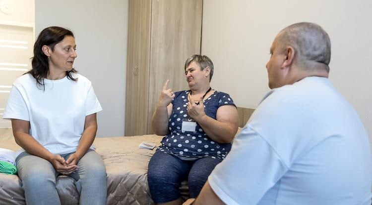 📔 «К такому тематическому заезду мы готовились дополнительно: сурдопереводчики обучали наш персонал азам общения с людьми с нарушениями слуха. Первые дни, когда пациенты приходят на приём к врачу и знакомятся с учреждением, сурдопереводчики находятся здесь постоянно, а дальше мы будем приглашать их по необходимости», – пояснила замдиректора по реабилитации многопрофильного центра Оксана Ерохина.