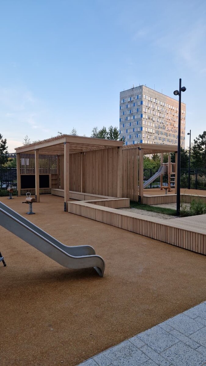 Когда мы говорим о благоустройстве жилого комплекса, чаще всего вспоминаем скамейки, озеленение, парковки. Но есть ещё одна важная часть — пространство для детей. В новом жилом комплексе в Москве мы реализовали проект для детского сада: палубы и веранды-навесы. 👣 Место первых шагов и игр