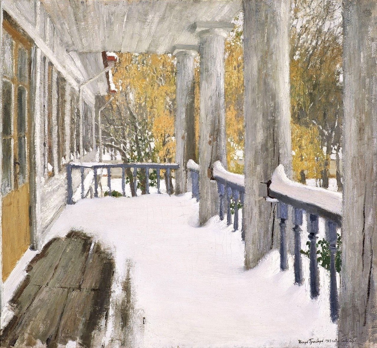 Проснувшись однажды утром, Грабарь обнаружил, что выпавший за ночь снег покрыл весь сад и террасу главного дома. «Зрелище снега с ярко-желтой листвой было столь неожиданно и в то же время прекрасно, что я немедленно устроился на террасе и в течение трех дней написал... картину...», – вспоминал художник.