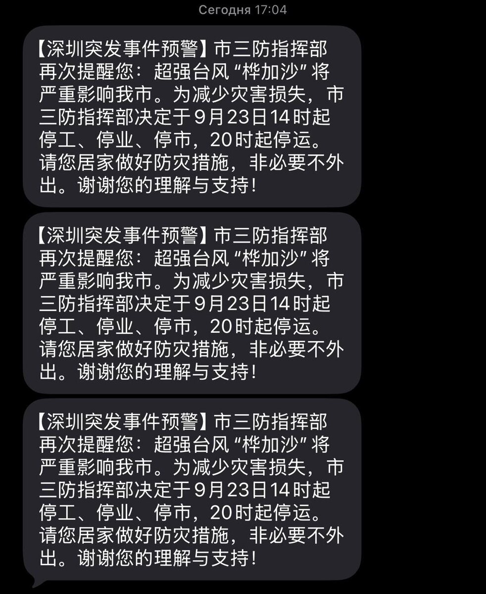Экстренное предупреждение для Шэньчжэня 🌀(и для всей провинции Гуандун) Управление по противодействию стихийным бедствиям вновь напоминает: сверхмощный тайфун «Хуацзяша» окажет серьезное влияние на город. Для минимизации ущерба Управление приняло решение приостановить работу предприятий, учреждений и рынков с 14:00 23 сентября, а с 20:00 прекратить движение транспорта. Просим граждан оставаться дома, соблюдать меры предосторожности и избегать выходов на улицу без необходимости. Благодарим за понимание и поддержку! Три сообщения за одну минуту и в приложении доставки уже почти ничего не работает 😶🌫️