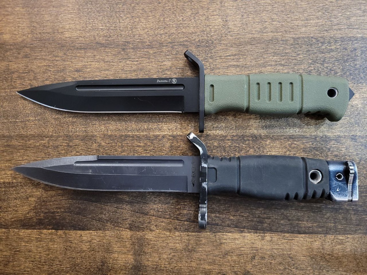 В ответ на пост Вот кстати говоря варианты исполнения. На первом фото рядом с оригинальным штык-ножом вариант от ПП "КИЗЛЯР" именуемый Витязь-Т. По сути клон, за исключением отверстия для крепления на оружие на гарде и отсутствием фиксатора на рукоятке. Ну и ножны другие, простого исполнения, без кусачек для проволоки. Зато гораздо легче. Нужно сказать, что Витязь-Т бывает в двух вариантах - "гражданского" исполнения, без гарды, и в "холодном" варианте. А вот на втором фото - нож производства компании САРО. Вот он уже сделан исключительно в хозбытовых параметрах, не смотря на внешний вид и гарду. Толщина клинка всего 2.4 мм. Не многие знают, что за ГОЗ на производство штык-ножей для МО боролись САРО и КАМПО. По сути техзадание было одно, разница была бы только в клейме производителя. Кто победил - все знают. А вот мультитулы для комплекта "Ратник" всё таки отдали компании САРО. Как нибудь рассмотрим. Он у нас тоже есть.