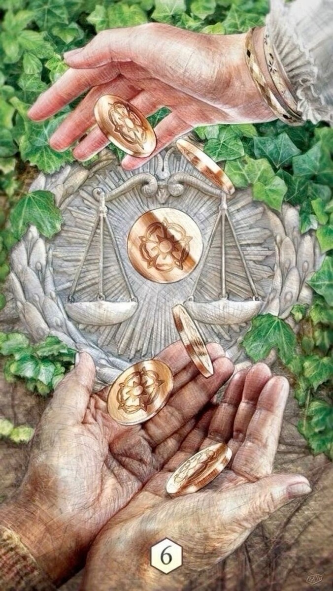 Эта карта символизирует справедливый, осознанный обмен — не только материальный, но и эмоциональный, духовный. Один даёт — другой принимает — и возвращает с благодарностью. Здесь нет зависимости, ни жертвенности, ни паразитизма. Обмен происходит из изобилия, а не из чувства долга или страха. Человек, стоящий сверху, раздаёт монеты не как милостыню, а как часть естественного цикла. В отношениях такая карта говорит о том, что партнёры умеют делиться: кто-то даёт ресурсы, кто-то — заботу, кто-то — время. Главное — никто не чувствует себя использованным. Энергия течёт по кругу, и каждый получает своё.