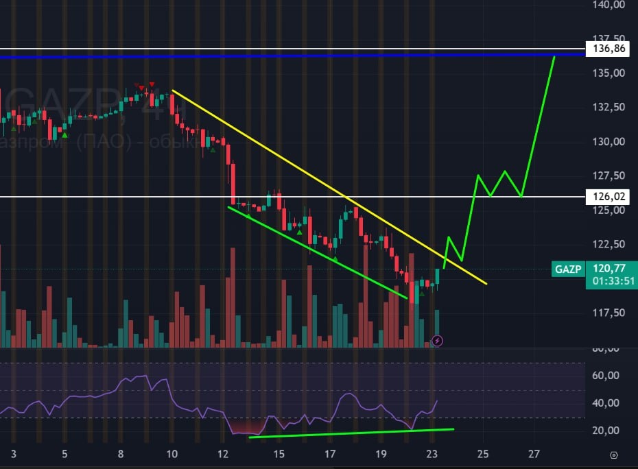 ⛽️ #ГАЗПРОМ #GAZP #GAZPF #bogdanoffinvest 🟢 Ранее обращал Ваше внимание, как доедают котлетчика во фьючерсе на Газпром. После этой спецоперации по отъему денег с котлетчика, Газпром рисует прекрасную, можно сказать идеальную разворотную картину. Следим за наклонной желтой линией. Пробьем ее, и будет расти еще легче. 🚗 Жду Газпром вверх. Особенно на начале более активных переговоров о будущей трехсторонней встрече.
