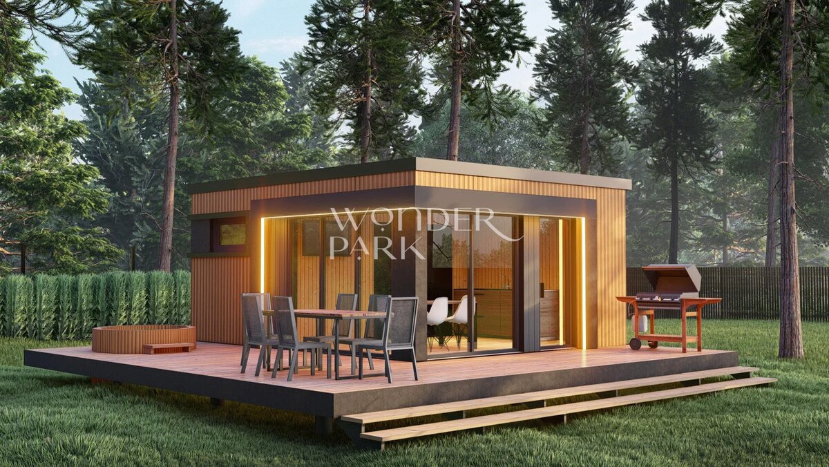 Современная мобильная баня в архитектурном стиле CUBE — это сочетание эстетики и комфорта. Панорамные окна, фасадная подсветка и просторная Г-образная терраса площадью 34 м² создают атмосферу уюта и стиля.