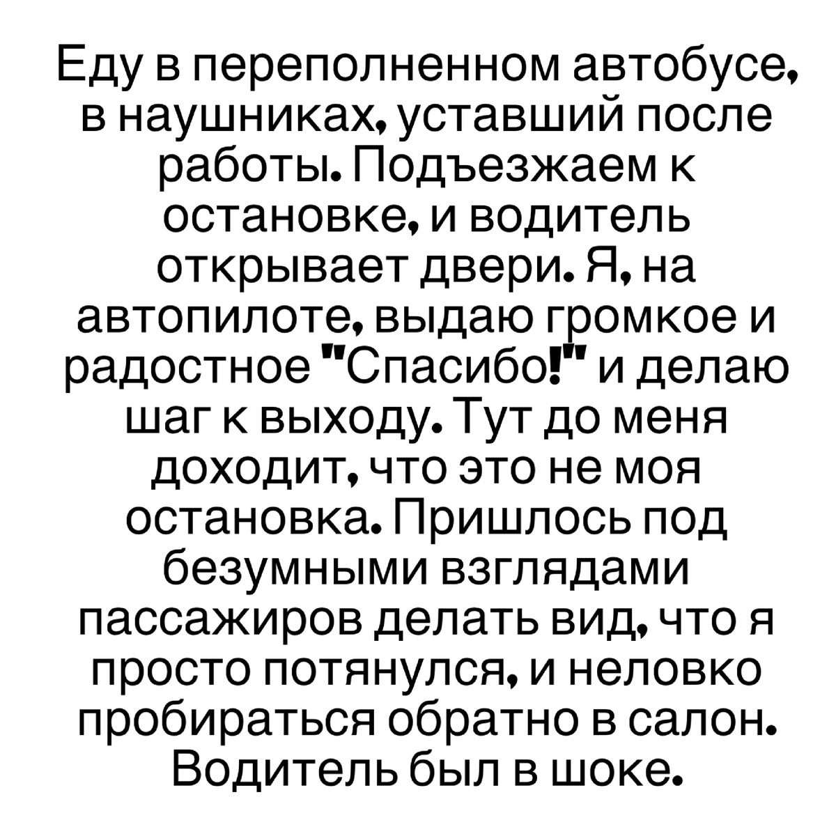 Еду в переполненном автобусе, в наушниках, уставший после работы. Подъезжаем к остановке, и водитель открывает двери. Я, на автопилоте, выдаю громкое и радостное "Спасибо!" и делаю шаг к выходу. Тут до меня доходит, что это не моя остановка. Пришлось под безумными взглядами пассажиров делать вид, что я просто потянулся, и неловко пробираться обратно в салон. Водитель был в шоке.