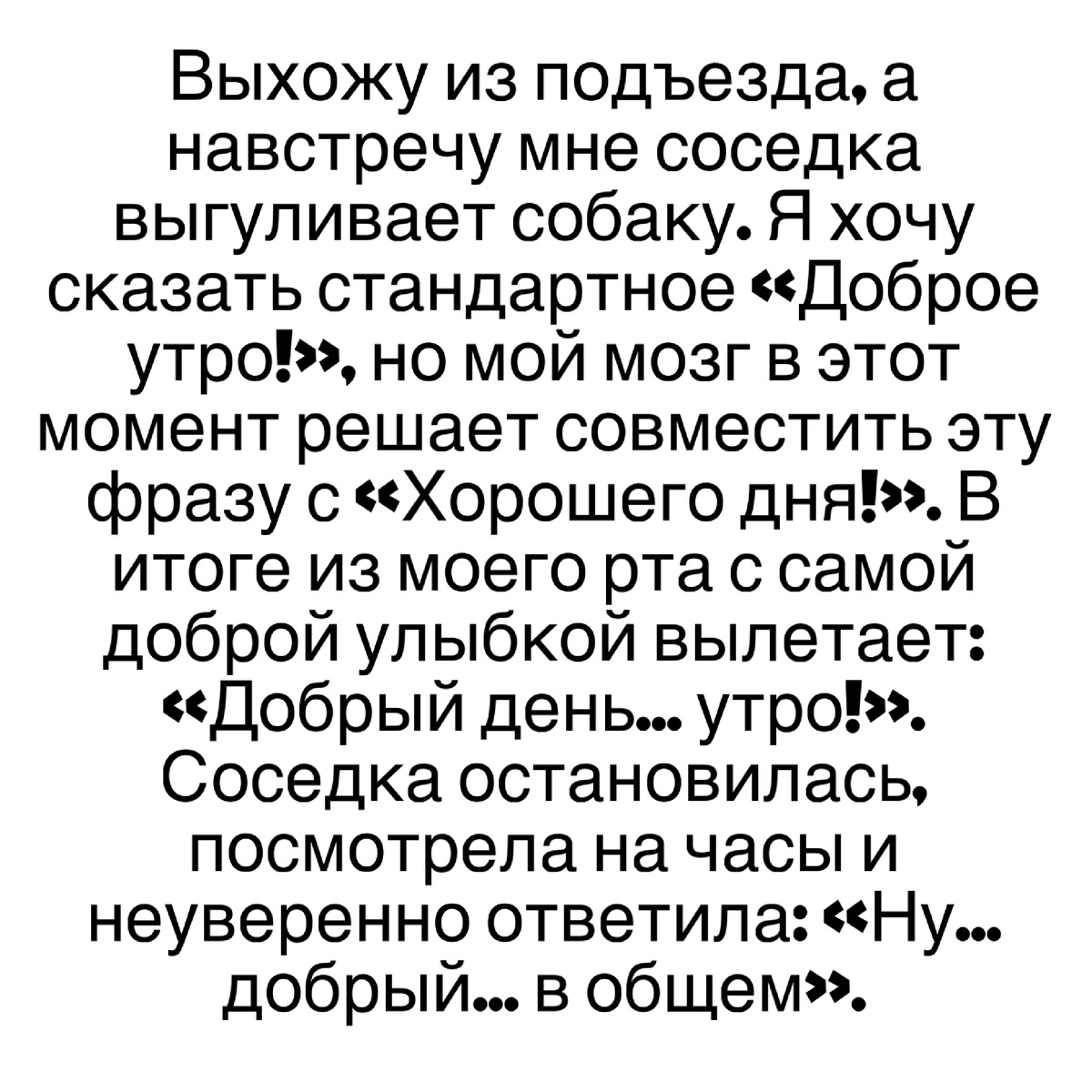 Выхожу из подъезда, а навстречу мне соседка выгуливает собаку. Я хочу сказать стандартное «Доброе утро!», но мой мозг в этот момент решает совместить эту фразу с «Хорошего дня!». В итоге из моего рта с самой доброй улыбкой вылетает: «Добрый день... утро!». Соседка остановилась, посмотрела на часы и неуверенно ответила: «Ну... добрый... в общем».