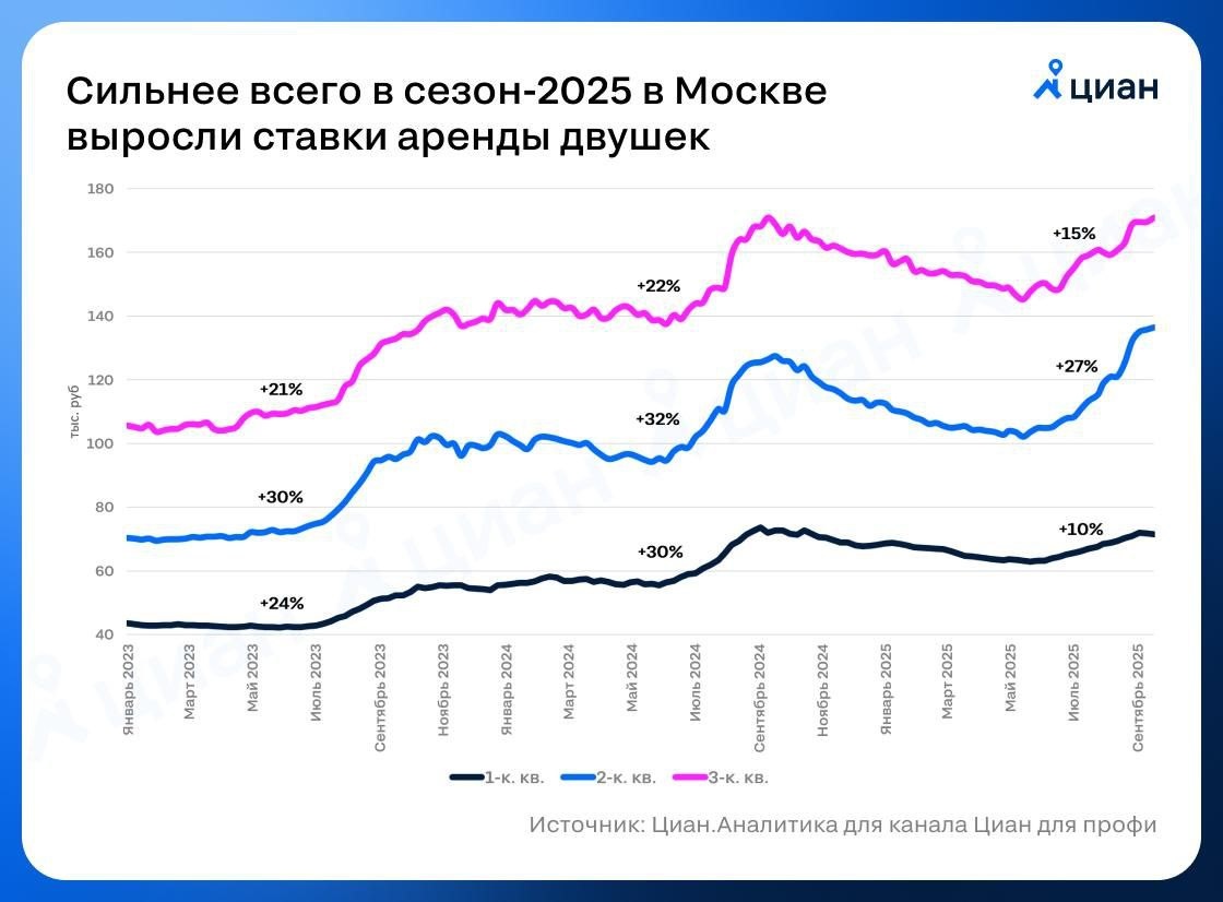 Руководитель ЦИАН Аналитика Алексей Попов сообщает, что двухкомнатные квартиры в Москве подорожали вдвое заметнее, чем остальное жилье в секторе аренды. «Высокий сезон на рынке долгосрочной аренды в Москве почти завершён. Как и ожидалось, рост ставок был менее заметен, чем в предыдущие 2 года. Эффект «высокой базы», замедление индексации зарплат и кратно больший выбор вариантов привели к увеличению расценок в июле-сентябре 2025 лишь на 15% (против ~+25% в 2023 и 2024 гг.). Единственное исключение — запрашиваемая стоимость аренды двушек вновь выросла более чем на четверть и превысила рекордные цифры прошлого года (136 против 127 тыс. руб.)», - сообщает ЦИАН. Основная причина, по мнению экспертов — рост спроса. Если в 2024 году на них пришлось 33% интереса аудитории, то летом текущего — почти 40%. 〰️А Вы сталкивались с повышением цен на аренду квартир? Что в приоритете при поиске? #недвижимость #аренда #ЦИАН #двушки #цены_аренда