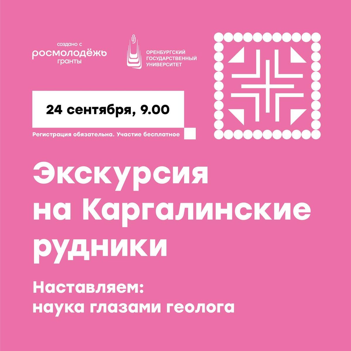 Приглашаем тебя в удивительное путешествие! 🤩 24 сентября состоится экскурсия по уникальным древним Каргалинским медным рудникам. Здесь история переплетается с природой, а древние металлургические технологии рассказывают о своём величии. Выезд запланирован в 09:00 от водонапорной башни возле ОГУ (проспект Победы, 14/1). Проект реализуется в рамках программы «Наставляем: наука глазами геолога». 📎 Возраст участников – от 14 лет. Запись обязательна по ссылке. Не упусти шанс узнать больше о нашем прошлом и насладиться красотой природы! 📍 Проект реализуется при грантовой поддержке Федерального агентства по делам молодёжи (Росмолодёжь) и консультационной поддержке Оренбургского отделения Русского географического общества. Участие - бесплатное! Ждём тебя на экскурсии! 👋 #ОГУ #в_ОГУ #OSU #Росмолодёжь #РосмолодёжьГранты