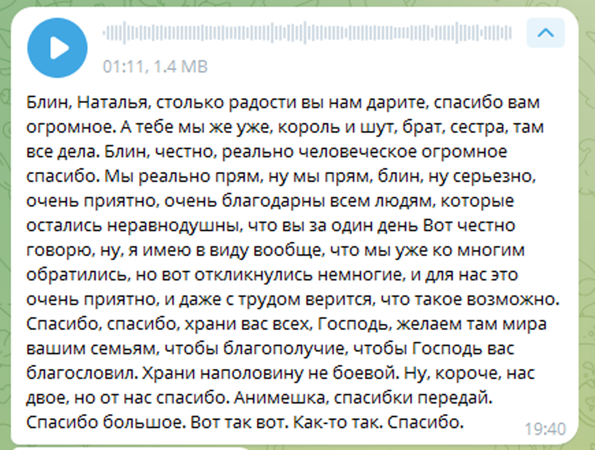 Это голосовое сообщение от Саши (прикладываю дешифровку, она корявая, как обычно) - там слова благодарности всем за помощь: