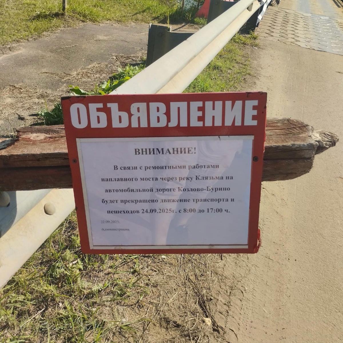 ВНИМАНИЕ! В связи с ремонтными работами наплавного моста через реку Клязьма на автомобильной дороге Козлово-Бурино будет прекращено движение транспорта и пешеходов 24.09.2025г. с 8:00 до 17:00ч. Подписаться на Канал в MAX 🇷🇺