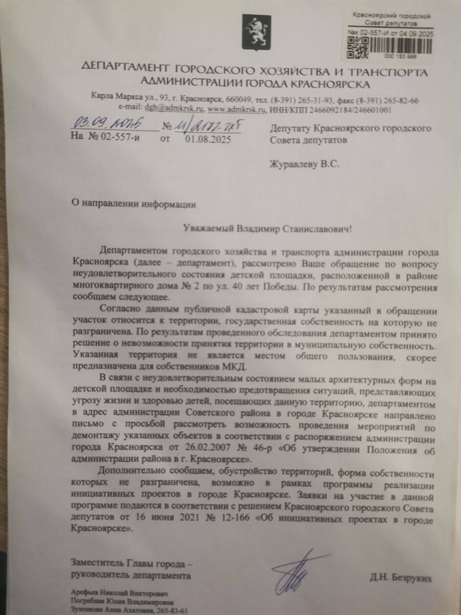 📍 Площадку по адресу проспект 60 лет Образования СССР, 35 признали аварийной. Сейчас пришёл ответ по ещё одной — 40 лет Победы, 2. Департамент городского хозяйства и транспорта направил в администрацию Советского района письмо с требованием демонтировать обе площадки.