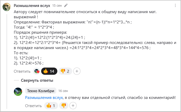 Комментарий под статьей (где был пример с факториалом) заставил меня задуматься: «И ведь таких людей много, которые преподносят свои «знания» как истинные, хотя сами жестко ошибаются». Факториал – казалось бы, что может быть проще: умножай числа от 1 до n и всё. Но... на практике он часто становится реальной проблемой. Почему? Давайте разбираться вместе. Вот тот самый комментарий: Смысл комментария заключается в следующем: Если факториал записать в примере разными способами: в одном как n!, а в другом как (n!) – то решение будет кардинально другим и ответы будут разными. Например, у нас есть два примера: Комментатор утверждает, что в первом случае получаем ответ 1, а во втором аж 576.