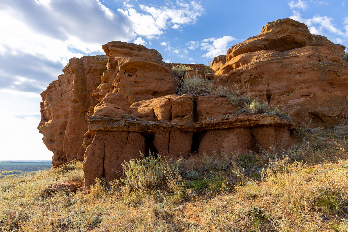 Обрыв сложен красноцветными косослоистыми песчаниками нижнетатарского