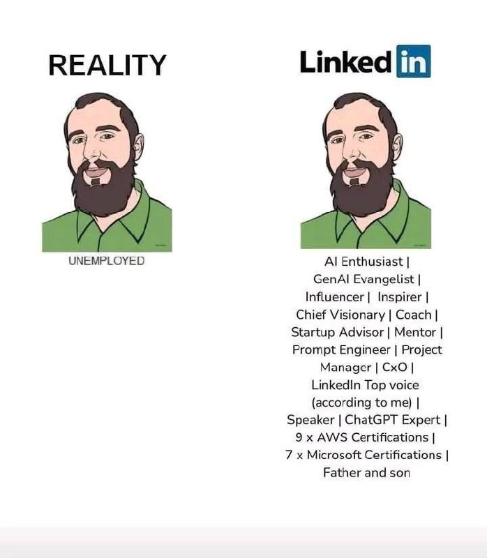 🚀 Реальность vs. LinkedIn: когда титулы начинают выдавать себя за карьеру 🚀 Слева — я в реальности: борода, зелёная рубашка и статус «UNEMPLOYED» (вот так, без эмоций). Справа — мой профиль на LinkedIn: AI Enthusiast | GenAI Evangelist | Influencer | Inspirer | Chief Visionary | Coach | Startup Advisor | Mentor | Prompt Engineer | Project Manager | CxO | LinkedIn Top Voice (according to me) | Speaker | ChatGPT Expert | 9 x AWS Certifications | 7 x Microsoft Certifications | Father and son Да, я не работал 3 месяца, но успел стать экспертом в 12 областях и отцом-советником одновременно. Теперь мне даже не нужно устраиваться на работу — просто пишу "I'm a visionary" и жду приглашения от Silicon Valley. 💡 Мораль: если ты не можешь найти работу — создай свою собственную должность. А если это не сработает — напиши "Top voice on LinkedIn" и надейся, что кто-то поверит. Ампилов про ИТ: https://dzen.ru/id/623d938f380f3715018b6e3c