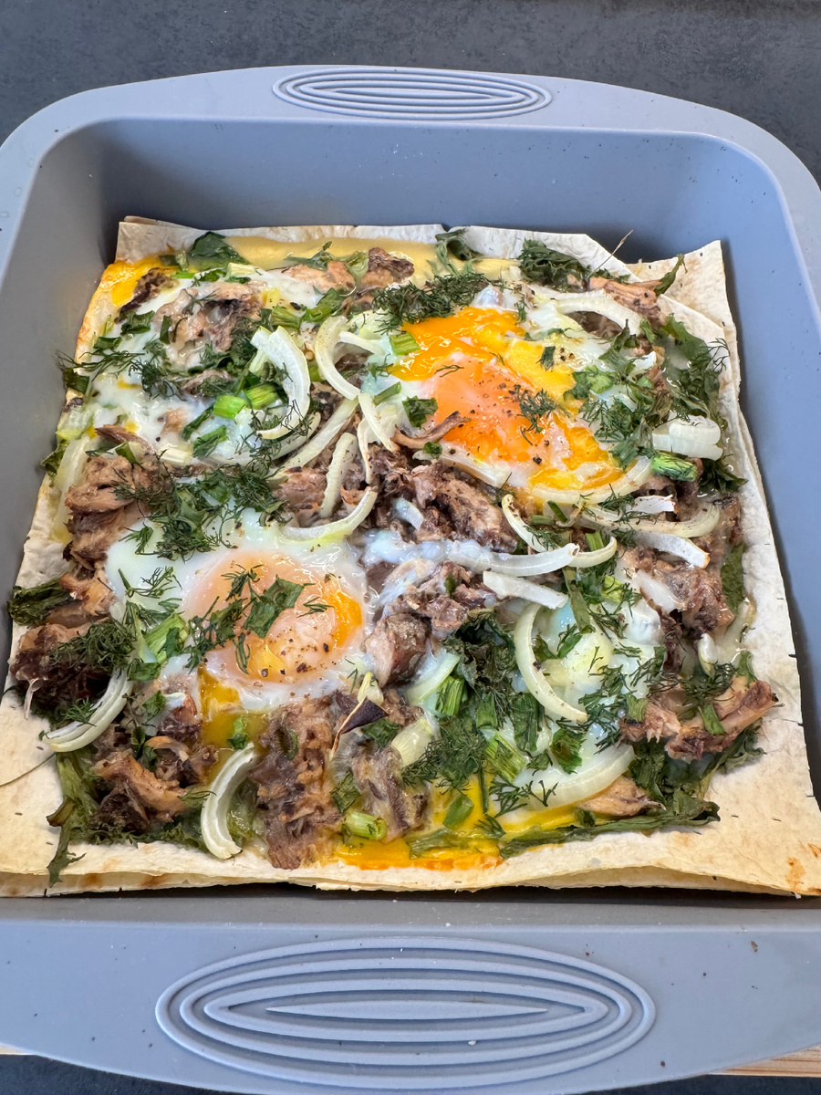 Иногда в жизни бывают дни, когда хочется быстро, вкусно и при этом полезно. Сегодня хочу поделиться своим рецептом, который подойдёт для завтрака, обеда или ужина и точно понравится тем, кто следит за фигурой и здоровым питанием. Ингредиенты: ✅ 1 баночка тунца (в собственном соку) ✅ 2 листа лаваша ✅ 4 яйца ✅ сыр ✅ листовая зелень (руккола, шпинат) ✅ лук ✅ свежая зелень (укроп, петрушка) ✅ соль, перец по вкусу Как готовить: 1️⃣ На противень стелем первый лист лаваша, посыпаем сыром. 2️⃣ Накрываем вторым листом. 3️⃣ Сверху кладём листовую зелень, тунец, нарезанный лук и разбиваем яйца. 4️⃣ Посыпаем свежей зеленью, приправляем солью и перцем. 5️⃣ В духовку на 25–30 минут при 180°C. Видеорецепт тут👇 Совет: цельнозерновой лаваш даёт длительные углеводы, которые помогают оставаться сытым, а зелень добавляет витамины и клетчатку для лёгкости пищеварения. Польза такого блюда: Такое блюдо легко вписывается в рацион для похудения или поддержания фигуры. КБЖУ (если делить пополам, на 1 п