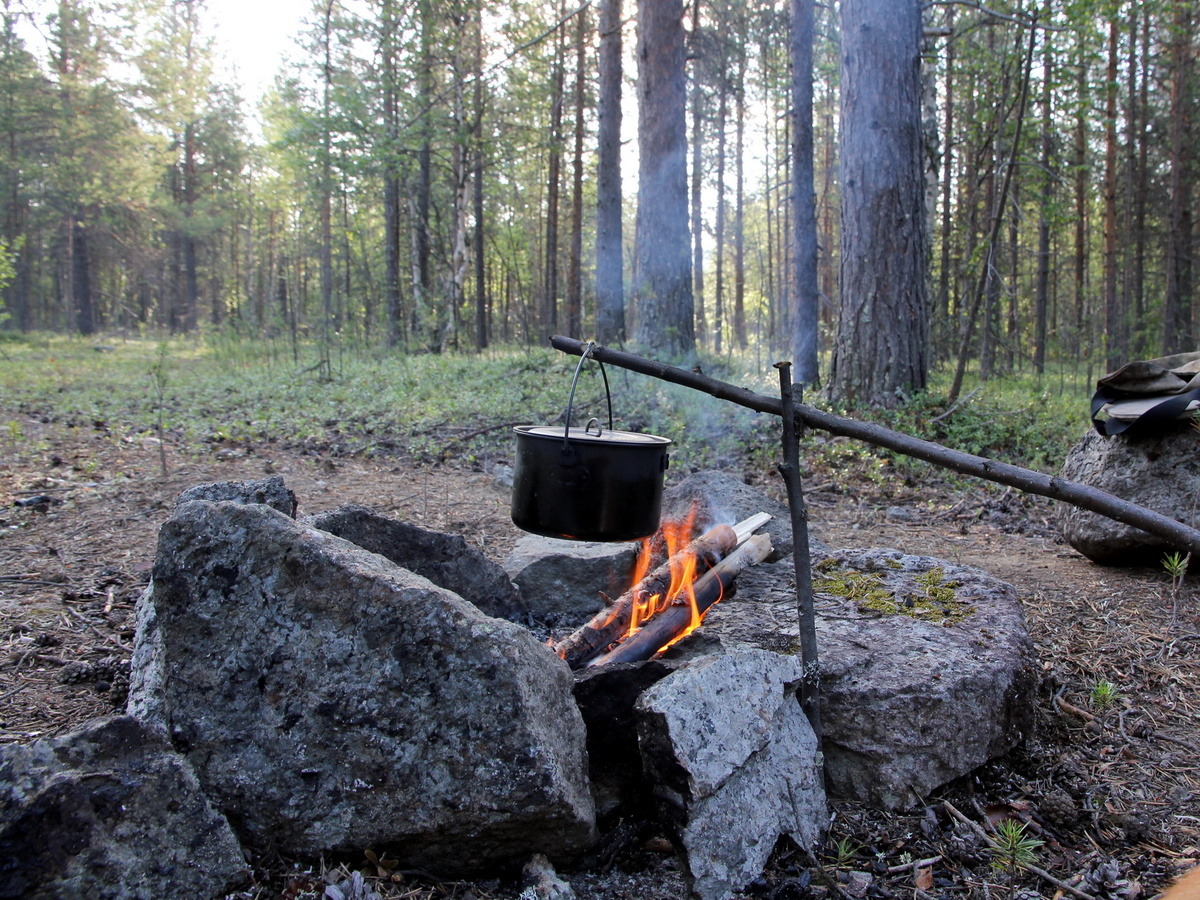 Не забудьте взять в поход комплект котелков/кастрюль (канов) и приспособления для их установки или подвешивания над огнем (тросик, таганок, крючья или другие).