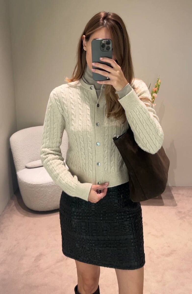 Слегка укороченный, с мягкими резинками и пуговицами из перламутра. Мы связали его в две нити из тонкой и пушистой кашемировой пряжи из Внутренней Монголии. Легкий и теплый кардиган подойдет ко всему — универсальные оттенки и аккуратная посадка