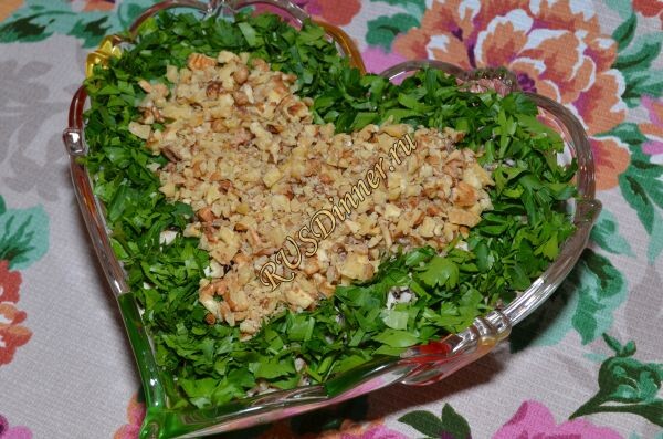 Салат "Сердце" Ингредиенты: Чернослив - 130 гр. Грибы шампиньоны - 150 гр. Куриная грудка - 150 гр. Петрушка - 1 пуч. Орехи грецкие - 50 гр. Сыр - 100 гр. Лук репчатый - 1 шт. Майонез - 70 гр. Масло растительное - 30 мл. (для поджарки) Источник: https://rusdinner.ru/page/salat-serdtse