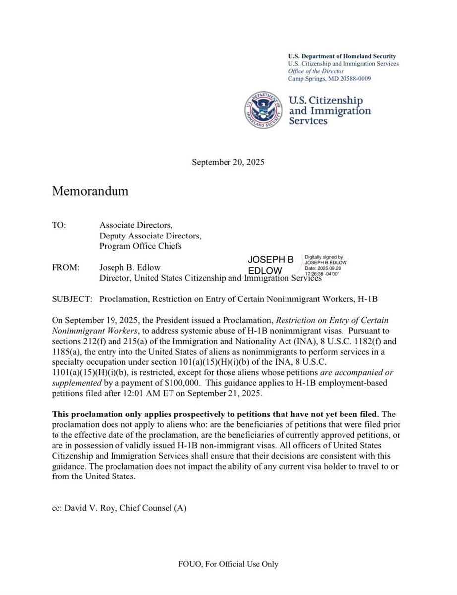Новый указ США! 19 сентября 2025 года Президент США подписал новый указ, который вводит ограничения на въезд иностранных специалистов по визам H-1B. Это решение направлено на борьбу с недобросовестным использованием этого вида визы. С 21 сентября 2025 года, если заявка на визу H-1B не будет сопровождаться доплатой в размере 100 000 долларов, иностранцы не смогут получить визу для работы по специальности в США. ❗️ Это правило касается только новых заявок, поданных после этой даты. Также новый указ не ограничивает право въезда в США для тех, кто уже обладает действующей визой H-1B. В условиях новых ограничений на визы H-1B, возможно, стоит рассмотреть альтернативные варианты для получения американской визы. Одним из таких способов может быть лотерея Green Card, которая предоставляет шанс на постоянное место жительства в США. Несмотря на то что это не прямое решение для специалистов, Green Card может стать реальным вариантом для тех, кто хочет работать и жить в Америке. #новости
