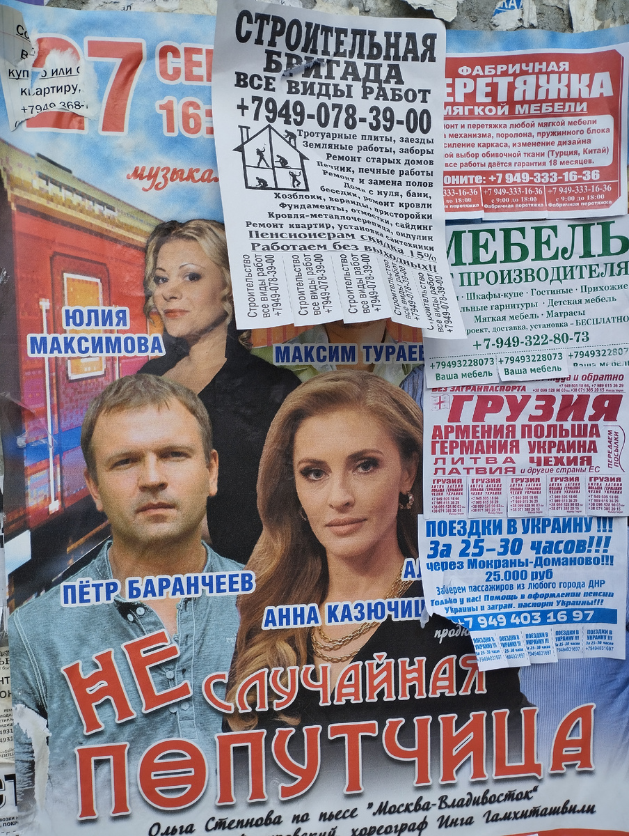 Наверное, в городах Большой России на остановках общественного транспорта нигде не встретишь большие щиты для расклеивания объявлений, а в Донецке подобное ещё можно увидеть. Я давно слежу за тем, как меняется тренд, отражая одновременно изменения в жизни моего города. В 2014-том сначала повсюду покупали волосы и предлагали работу для женщин. Ну, вы понимаете какую. Немного позже в дело вступили наши перевозчики. Когда ситуация более-менее стабилизировалась, они наперебой предлагали поездки на ту сторону линии разграничения. Далее стали предлагать съездить в Ростов-на-Дону в супермаркет за продуктами. Потом стали в другие российские города ездить, но до 2022-го и в противоположную сторону. Даже через через территорию России. Ну, и сейчас предлагают варианты через разные страны, включая Грузию, Армению и Польшу. В последнее время щиты на остановках, у подъездов, столбы и стены заклеивают строители. Они ринулись в Донецк бригадами, как ранее бригадами ехали в Москву: Как-то один из стро