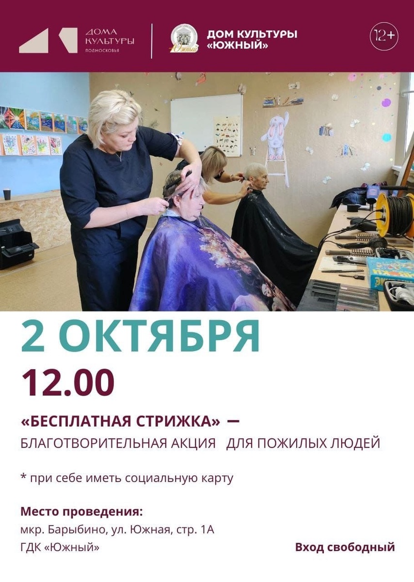 ✨ 🌼 Дорогие бабушки и дедушки! 🌼 Информируем вас ,что 2 октября с 12.00 до 14.00 состоится акция «Бесплатная стрижка» 💇🏼♀️ ❗️ С собой иметь социальную карту! ❗️ В 14:00 мы ждем вас на развлекательную программу «Тепло сердце даря друг другу». 🚫 Возраст: 55+ 📆 02.10.2025 🏢 Городской дом культуры «Южный» 📍 г.о.Домодедово, мкрн.Барыбино, ул.Южная, стр1А 💰 Вход свободный❗️ ✅ Мероприятия Домодедово https://dzen.ru/id/66f10385cc4c5a16f7b5fb02 http://vk.com/domodedovo_events http://dzen.ru/domodedovo_events