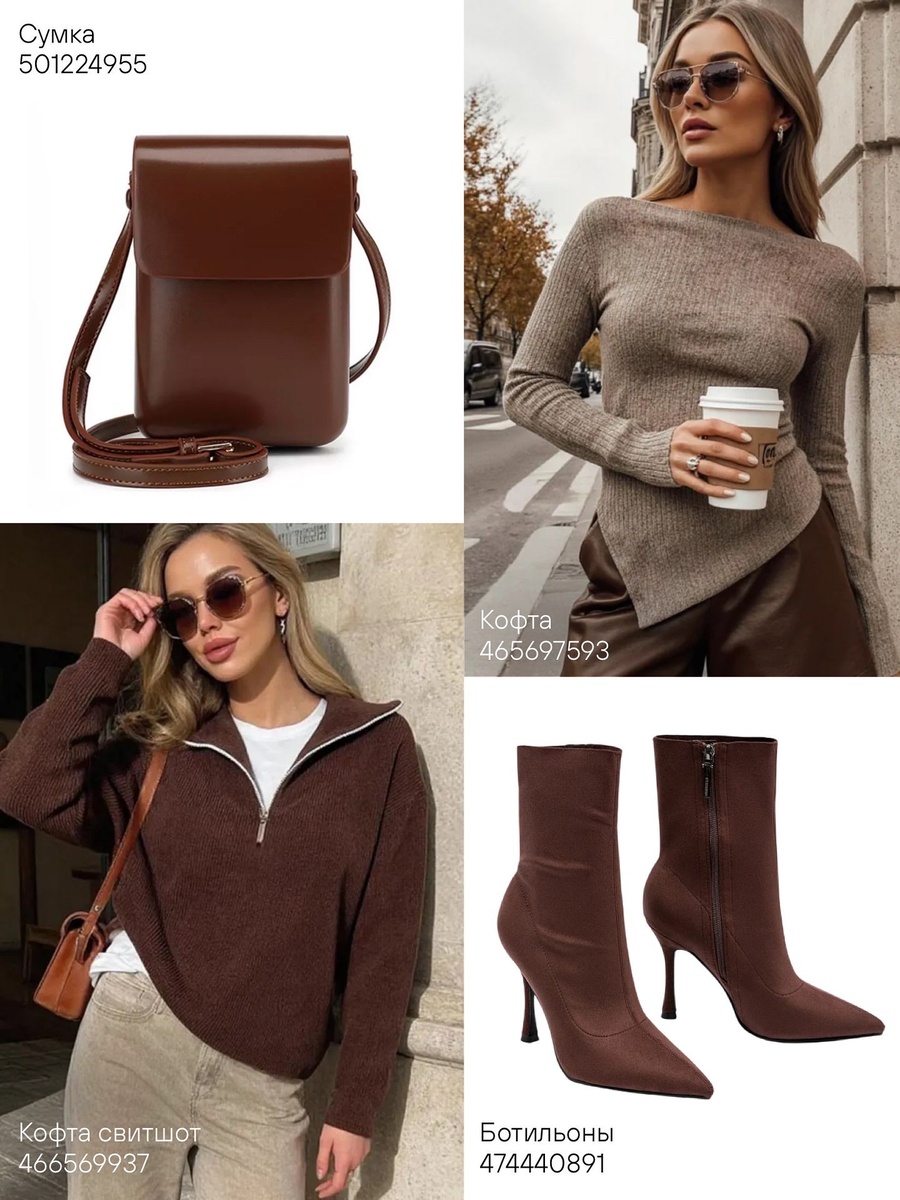 Кофейные оттенки, чистые формы и правильные фактуры — все, что делает образ дорогим без усилий. На фото — моя мини-капсула: сумки, трикотаж, джинсы, кроссовки и два типа ботильонов. Ниже разбираю каждую находку строго по порядку с артикулами, рассказываю, как сидит, с чем дружит и где носить. В конце — готовые формулы луков.