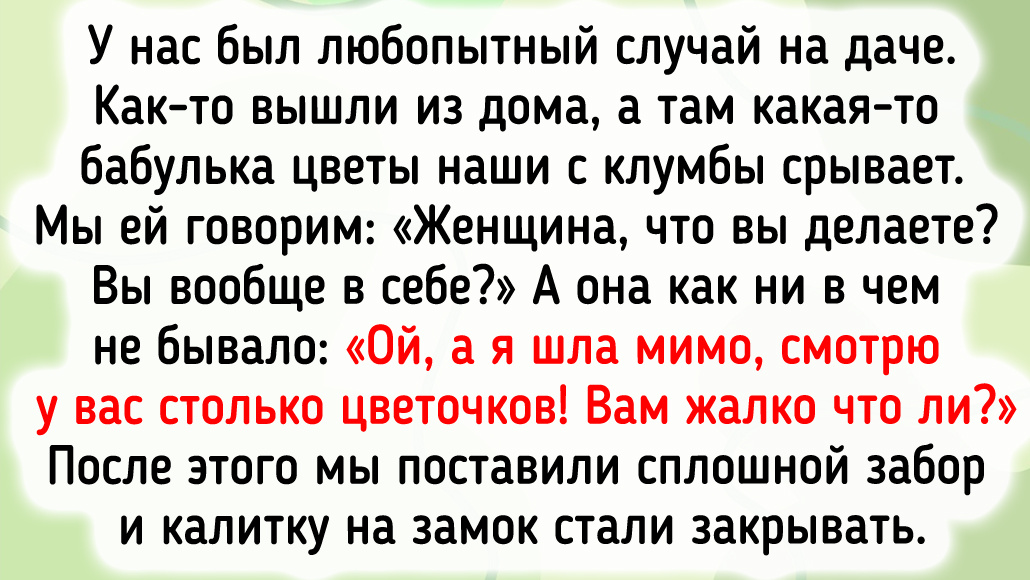 - У нас был любопытный случай на даче. Как-то вышли из дома, а там какая-то бабулька цветы наши с клумбы срывает. Мы ей говорим: «Женщина, что вы делаете? Вы вообще в себе?» А она как ни в чем не бывало: «Ой, а я шла мимо, смотрю у вас столько цветочков! Вам жалко что ли?» После этого мы поставили сплошной забор и калитку на замок стали закрывать. © iskiba