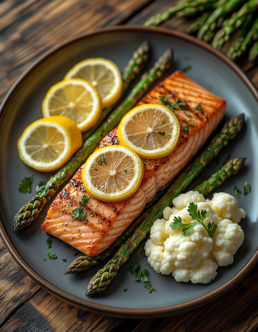 Обеденное блюдо: лосось с пюре из цветной капусты, украшенное спаржей и дольками лимона