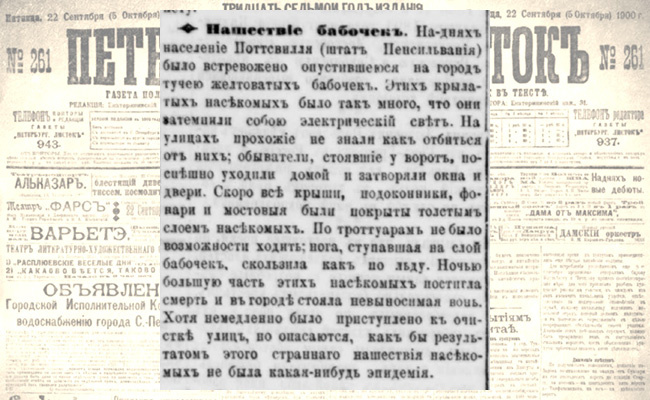 На днях население Поттсвиля (штат Пенсильвания) было встревожено опустившуюся на город тучею желтоватых бабочек. Этих крылатых насекомых было так много, что они затемнили собою электрический свет. На улицах прохожие не знали как отбиться от них; обыватели, стоявшие у ворот, поспешно уходили домой и затворяли окна и двери. Скоро все крыши, подоконники, фонари и мостовые были покрыты толстым слоем насекомых. По тротуарам не было возможности ходить; нога, ступавшая на слой бабочек, скользила как по льду. Ночью часть этих насекомых постигла смерть и в городе стояла невыносимая вонь. Хотя немедленно было преступлено к очистке улиц, но опасаются, как бы результатом этого странного нашествия насекомых не была какая-нибудь эпидемия.