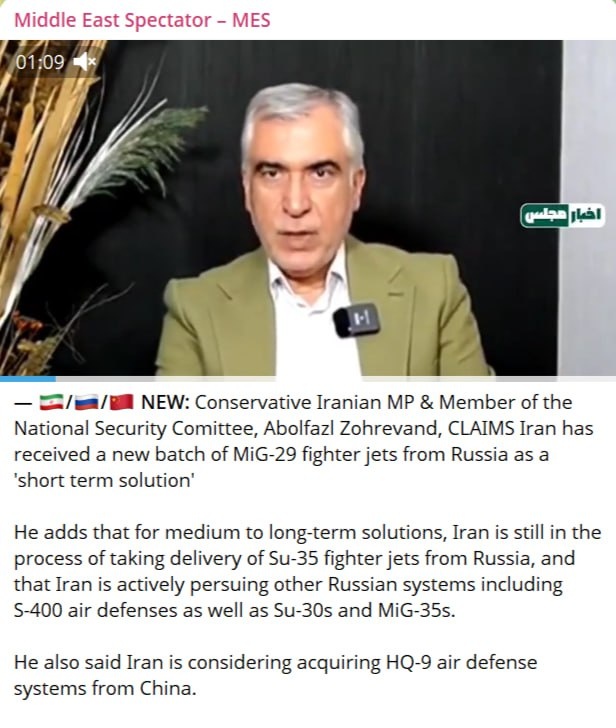 В ответ на пост Весьма характерны новости с двух сторон: Иранский депутат от консервативной партии и член Комитета по национальной безопасности Абольфазл Зохреванд УТВЕРЖДАЕТ, что Иран получил новую партию истребителей МиГ-29 из России в качестве "краткосрочного решения". Он добавляет, что для средне- и долгосрочных решений Иран все еще находится в процессе получения поставок истребителей Су-35 из России и что Иран активно использует другие российские системы, включая системы ПВО С-400, а также Су-30 и МиГ-35. Он также сообщил, что Иран рассматривает возможность приобретения систем ПВО HQ-9 у Китая. Премьер-министр Биньямин Нетаньяху озвучил новогодний тост на собрании Генерального штаба Армии обороны Израиля: «Мы находимся в разгаре борьбы, в которой побеждаем наших врагов, и нам нужно уничтожить иранскую ось, и это в наших силах. Вот что ждёт нас в наступающем году, который может стать историческим для безопасности Израиля». Очень маловероятно, что Израиль даст возможности Ирану