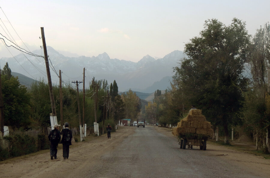 Частники сюда, как и на весь южный берег Иссык-Куля, отправляются от автостанции на Токтогула, но рано утром, когда народ ещё и в город-то ехать не начал, нам пришлось раскошелиться на такси (порядка 700 сом) - зато прямо до ущелья. На фото - утренний абрис вершин над посёлком, вид практически от трассы. Как всегда, не буду пытаться опознать конкретные вершины, но слева вроде бы Каракольский пик (5216м), которым с другой стороны мы любовались в прошлой части: