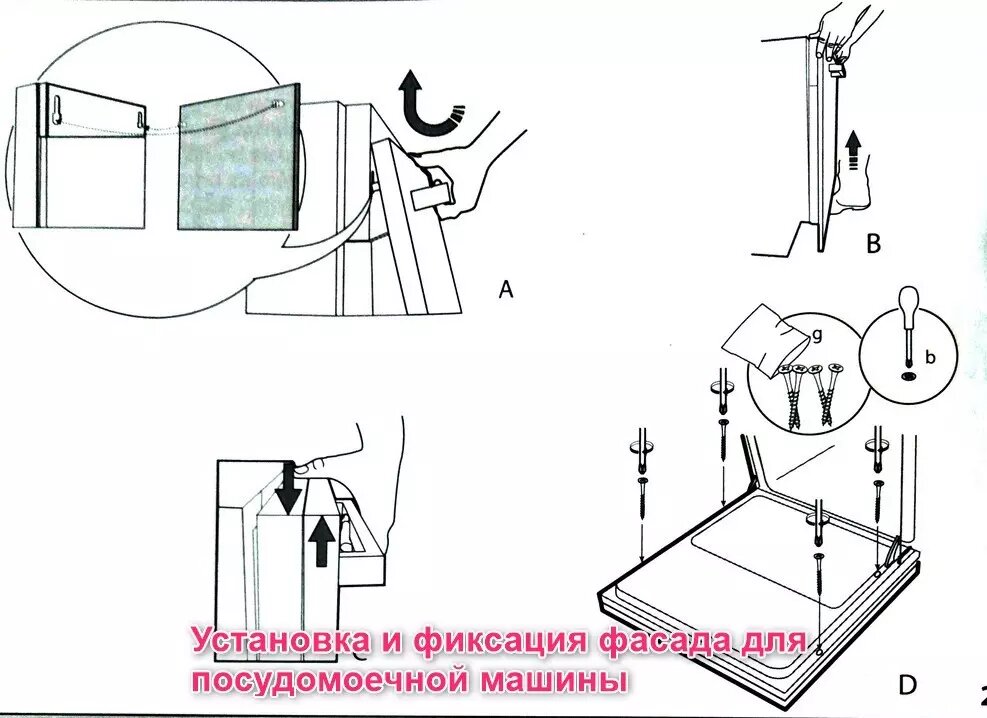 - Затяните все крепления. Используя отвертку или шуруповёрт, окончательно подтяните саморезы. Важно не перетягивать — иначе можно повредить фасад или дверцу посудомоечной машины.