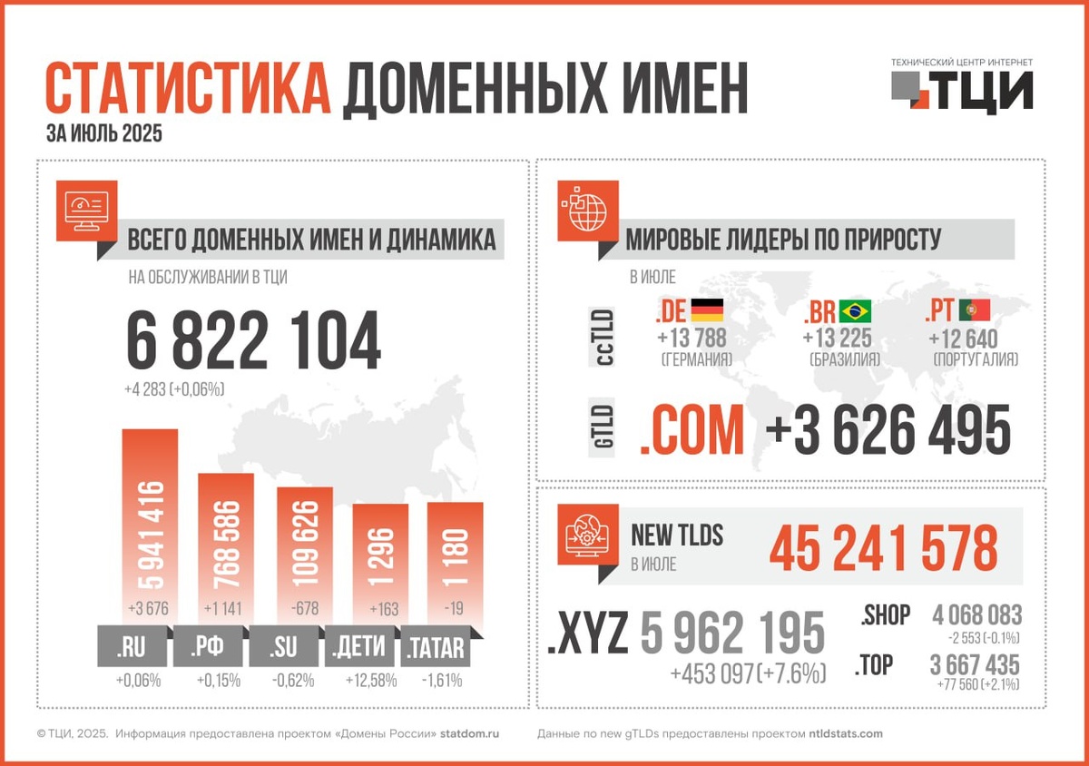 Данные по доменам в России. См. картинку. Число доменных имён в зоне .RU — 5 941 416, а общее количество 6 822 104. Тихонько растем :). Цифры за июнь 2025.