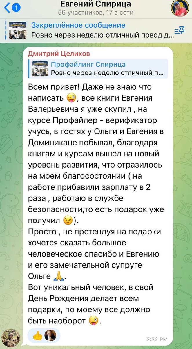 Друзья, конкурс в разгаре! Еще два дня можно принять участие, условия - в предыдущем сообщении😉 Спасибо всем, кто уже прислал классные истории - многие с юмором и огоньком)) И спасибо Дмитрию за добрые слова и отзыв (см скрин) Образование - сила! Ну, а сегодня по традиции встречаемся в открытом коммуникативном клубе на тренировку в 20.00 мскв.: ссылка на клуб #спирица #конкурс #клубыicds #профайлинг #детекциялжи