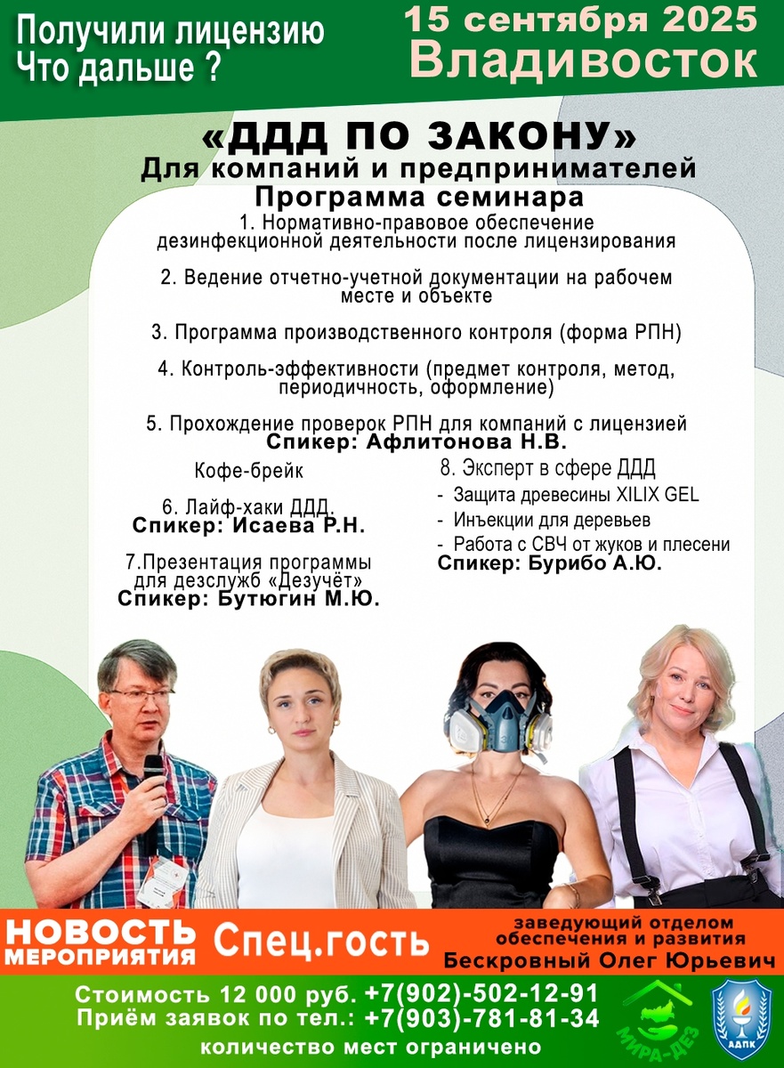 15 сентября 2025 г. прошел завершающий семинар "ДДД по закону", который состоялся в городе Владивосток. Прибыли гости из разных регионов: Камчатский край, Хабаровский край и др. Спец. гость нашего семинара-Бескровный Олег Юрьевич ФБУЗ Центр гигиены и эпидемиологии https://vk.com/wall-214502648_712 - для ознакомления с информацией