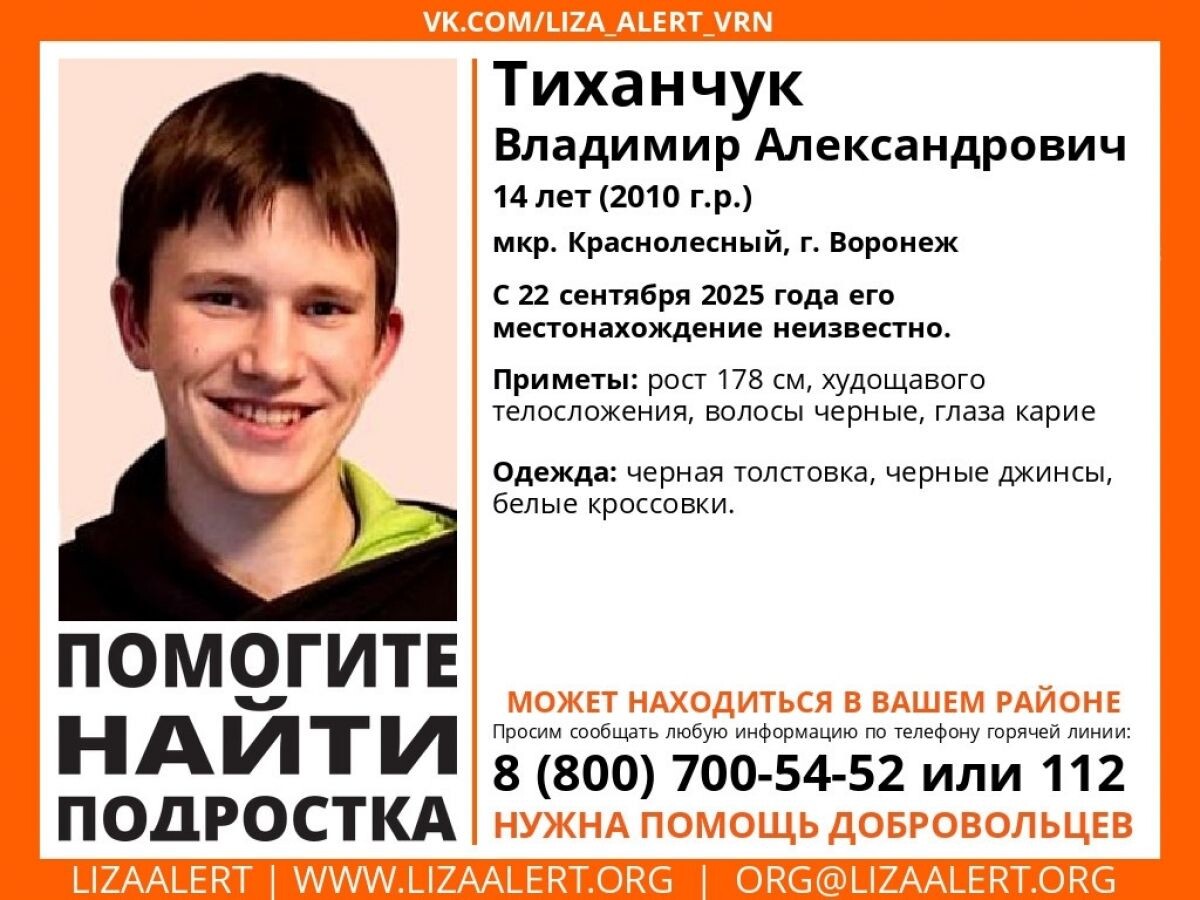 В Воронеже на территории микрорайона Краснолесный пропал 14-летний Владимир Тиханчук. Ориентировка появилась в социальных сетях поискового отряда "ЛизаАлерт" Воронежской области. Юноша перестал выходить на связь с близкими 22 сентября, с тех пор его местонахождение неизвестно. Приметы пропавшего: рост 178 см, худощавое телосложение, черные волосы и карие глаза. В последний раз подростка видели в черной толстовке и такого же цвета джинсах, на ногах у него были белые кроссовки. Если вам что-то известно о пропавшем подростке, просим вас позвонить на горячую линию отряда по телефону 8-800-700-54-52 или на номер 112. Обновление: как сообщил "Воронежским новостям" знакомый семьи пропавшего, подросток вышел из дома, чтобы поехать к маме. У него не было с собой телефона. Напомним, ранее воронежские волонтеры нашли пропавшую без вести в столице Черноземья 15-летнюю девочку. На поиски подростка ушло два дня.