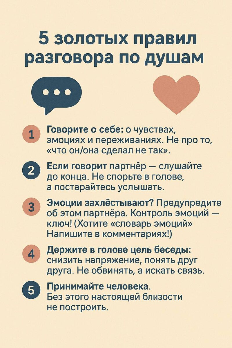 Народ, продолжаем тему кризисов в паре! 🫣 Почему все в кризисе советуют «больше говорить», а разговор не помогает? Может, мы говорим не о том? 🤔 Как я упоминал в прошлом посте, для гармоничных отношений нужна гармония в сердце, душе и голове! 💡🧠💖 Это про ваши эго-состояния (Родитель, Взрослый, Дитя). Когда у руля Взрослое состояние, вы не живете иллюзиями Родителя или эмоциями Дитя. Вы живете «здесь и сейчас» и каждый день выбираете партнера, с которым можете быть собой. Это идеал, который встречается, увы, не так часто. Но вернемся к разговорам. Фраза «Просто поговорите, и станет легче!» — опасное упрощение. Почему «просто поговорить» не работает? 1️⃣ Нет близости и принятия. Без этого фундамента хоть говорись до хрипоты — ничего не выйдет. Это как пытаться построить дом без фундамента. 2️⃣ Неумение говорить. Часто вместо того, чтобы говорить о себе, люди начинают выливать на партнера свои зажимы, обиды и претензии. Это не диалог, а атака. 3️⃣ Культ «развития». Сейчас в трен
