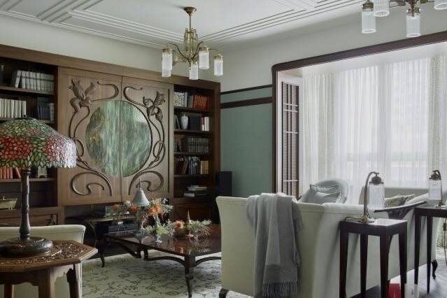 Стильная основа: Последнее десятилетие XIX века. Европа стремительно меняется: индустриализация, новые технологии, новые взгляды на искусство. На смену строгим классическим интерьерам приходит модерн — стиль, который отказывается от прямых линий и ищет вдохновения в природе. В архитектуре и интерьерах рождаются плавные, текучие формы, будто линии растений и воды оживают в мебели, окнах, дверях. Растительные орнаменты, изогнутые стебли, витражи с переливами жёлтого, зелёного и синего создают ощущение живого пространства. Атмосфера усиливается сложными оранжевыми оттенками, золотыми акцентами и насыщенной палитрой. Дерево покрывается тонкой резьбой, графика становится декоративной, детали — почти ювелирными. Главное правило модерна — никаких жёстких прямых и аскетизма. Здесь всё перетекает одно в другое: стены в узорах, мебель в изгибах, свет — в цветных витражах. Интерьер превращается в художественный сад, где каждый элемент продолжает мотив природы. Модерн — это идея единства искус