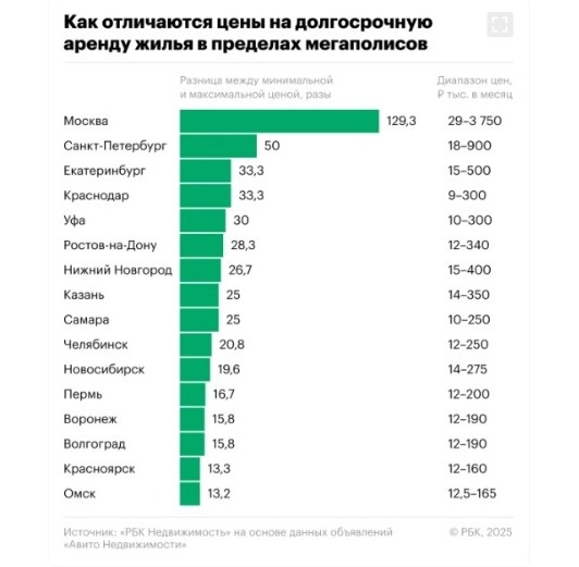 Исследование проводили журналисты «РБК Недвижимость». Здесь говорят, что в большинстве мегаполисов, а именно в 9 из 16, разница в стоимости аренды самой дорогой и самой дешевой квартиры укладывается в 15–30 раз. Волгоград смог уложиться в отчасти самый минимальный показатель — 15,8. Похожая ситуация сегодня наблюдается в соседнем Ростове, Нижнем Новгороде, Казани, Самаре, Челябинске, Новосибирске, Перми, Воронеже. Речь идет о квартирах, которые сдаются в долгосрочную аренду. Наименьшая разница между предлагаемой ценой долгосрочной аренды самого дорогого и самого дешевого жилья выявилась в двух миллионниках — Красноярске и Омске (13,3 раза). Самый большой разбег цен — в Москве. Здесь арендные ставки отличаются в 129,3 раза — от минимальных 29 тысяч рублей до максимальных 3,75 миллионов рублей в месяц. Для анализа использовали данные объявлений о долгосрочной сдаче жилья, размещенные на «Авито Недвижимости» и актуальные на середину сентября 2025 года. Учитывались объекты, расположенные в
