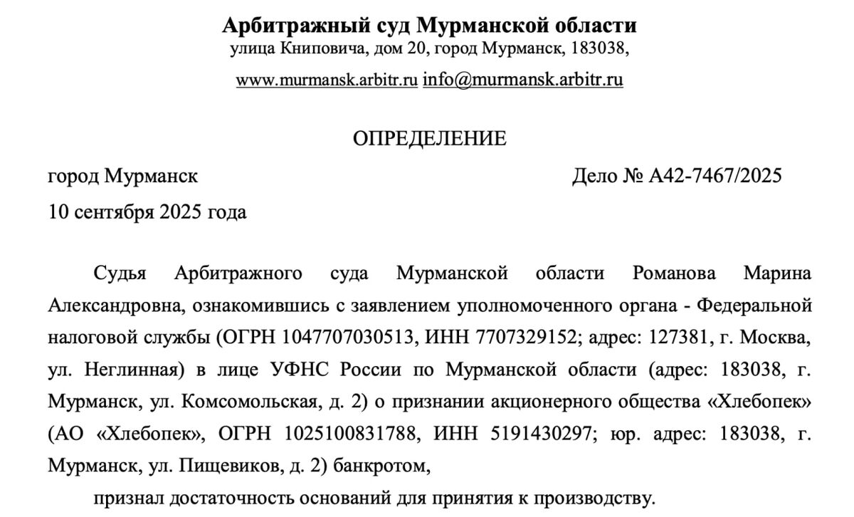 Как следует из определения, Арбитражный суд Мурманской области, ознакомившись с заявлением уполномоченного органа (УФНС) о признании акционерного общества «Хлебопёк», признал представленные основания достаточными и возбудил производство по делу. Сумма исковых требований – 9,03 млн рублей (где-то смеётся единственный подрядчик).