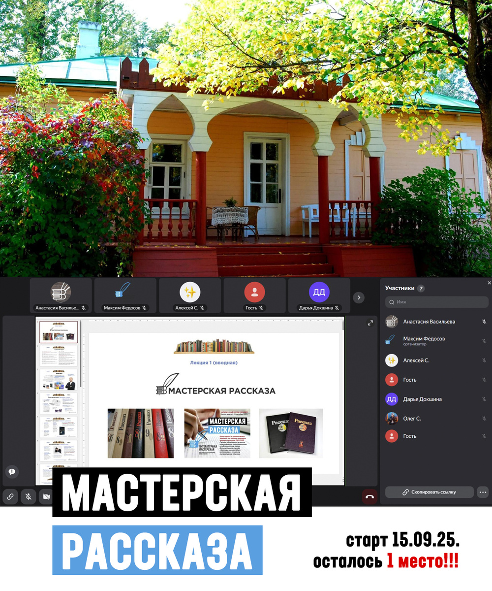Вчера, 22 сентября 2025 года прошла вторая лекция в нашей «Мастерской рассказа». Она была еще интереснее, чем первая (вводная), и наконец-то, мы вместе с нашими слушателями Мастерской начали постепенно подходить к разбору рассказов и к формированию историй и сюжетов для будущих произведений (вспоминаем, кто каждый слушатель курса за 10 лекций напишет свой новый собственный рассказ). Лекция была также "приправлена" впечатлениями от недавней поездки в Мелихово (на заглавной картинке вы видите террасу основной усадьбы А.П.Чехова). Напоминаю, что осталось 1 свободное место в Мастерской, кто хочет - может еще "запрыгнуть" на уходящий поезд наших лекций, тем более, что в личном кабинете все записи и рассказы хранятся до конца обучения. Ссылка на Мастерскую: https://master.novslovo.ru/